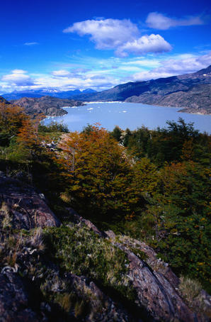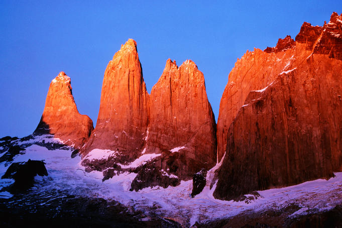 Reflection of hiker beneath Torres Del Paine on "W" trekking route.